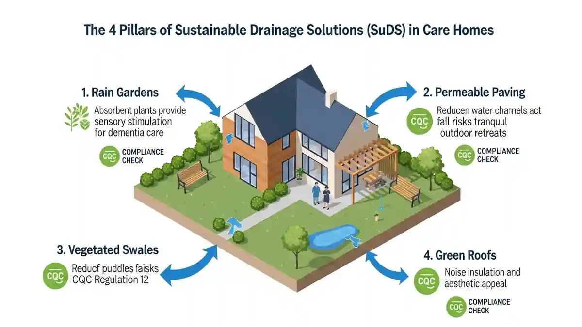 The future of sustainable drainage solutions CQC care home design is the integration of SuDS (Sustainable Drainage Systems). In Herne Bay, Policy EN18 of the Local Plan encourages SuDS to manage surface water runoff, which often plagues the surrounding area.
